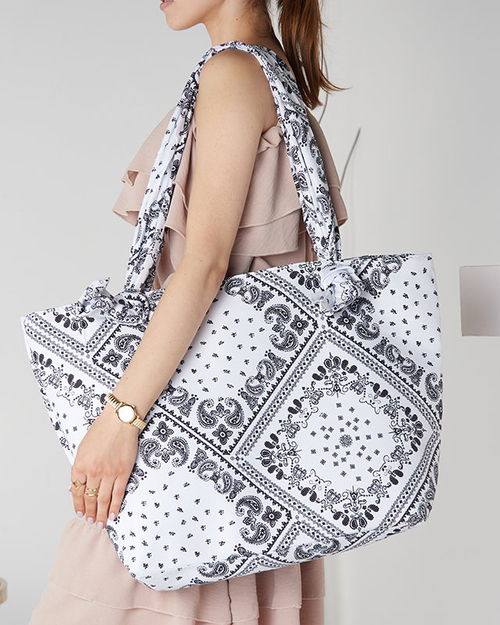- Sac en tissu élégant avec un motif cachemire. Sac à main avec anses nouées, zippé, a 1 poche à l'intérieur. Parfait pour la plage !
