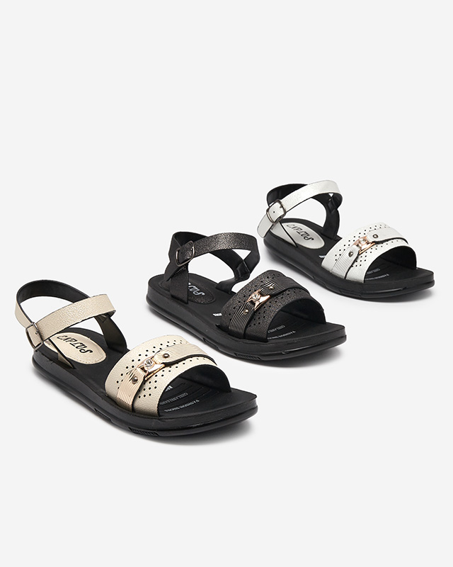 - Sandales pour femmes uniques en cuir écologique sur une semelle plate. Le modèle se ferme par une boucle à la cheville à l'extérieur. La tige avec des paillettes ajoute du charme ! REMARQUE : le modèle peut présenter des salissures délicates et des rayure