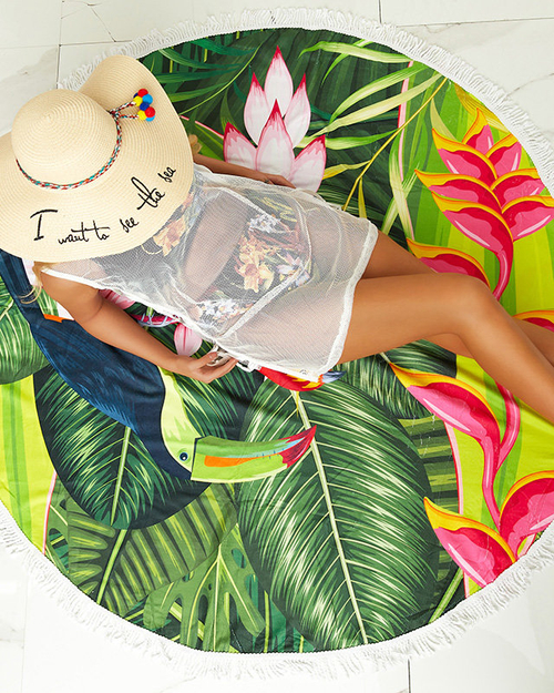 - Grande serviette de plage ronde en tissu lisse, agréable au toucher et doux. Le produit d'un diamètre de 155 cm est décoré d'un motif coloré. Je dois le mettre dans ta valise quand tu es en vacances ! REMARQUE : Précision de mesure (+/-) 1 cm.