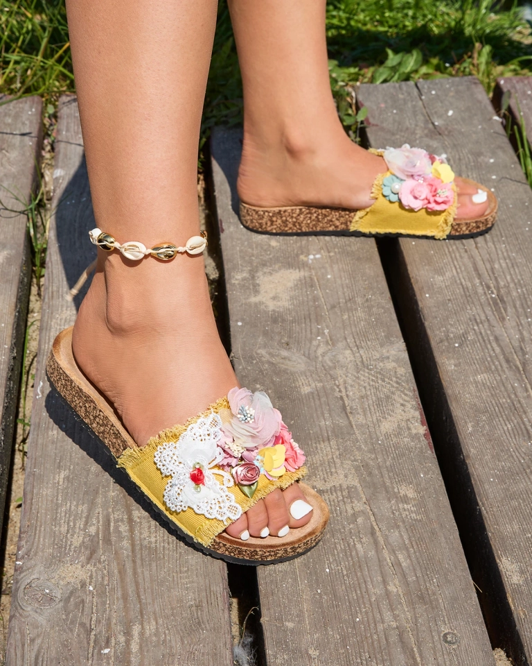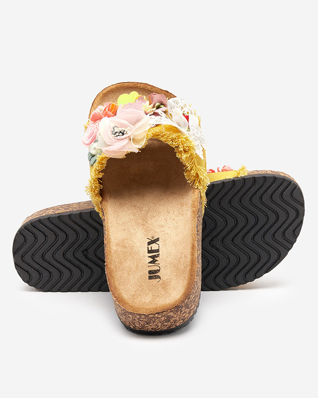 Pantoufles pour femmes avec fleurs en tissu en jaune Ososi - Chaussures