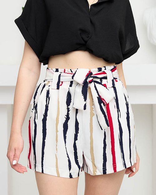 • Short très confortable et élégant en tissu doux et agréable. Modèle avec une bande élastique et une ceinture supplémentaire à la taille. Ils sont décorés d'un motif rayé ! REMARQUE : précision de mesure (+/-) 1 cm. Dimensions mesurées à plat.
