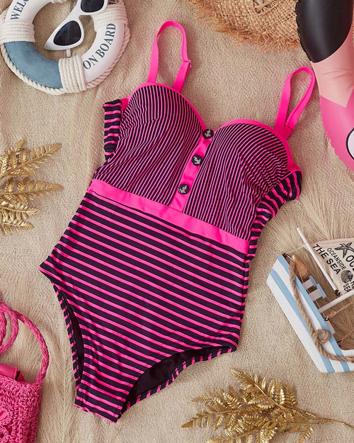 - Fantastique maillot de bain rayé pour femme, orné de boutons. Modèle avec bonnets rigides et push-up, dos noué et bretelles réglables. Je dois être dans ta valise pendant les vacances ! REMARQUE : Précision de mesure (+/-) 1 cm.