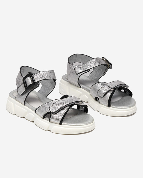 - Sandales pour filles efficaces sur une semelle plate, en tissu brillant. Chaussures fermées par une boucle autour de la cheville et un velcro sur la pointe. Au milieu, une semelle intérieure en cuir écologique doux. Parfait pour les journées chaudes !