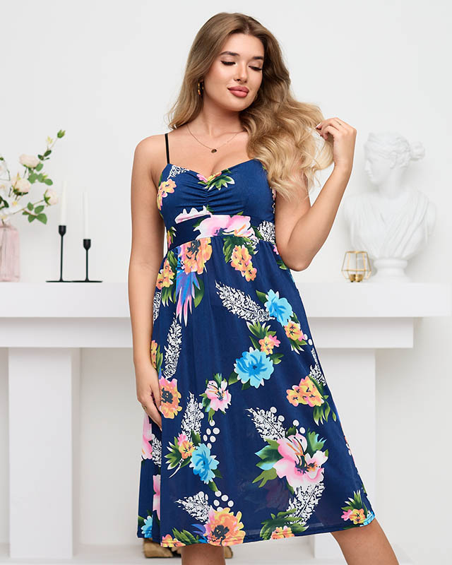 - Robe de longueur genou à motif fleuri. Modèle à la coupe ample, doté d'une découpe à la taille avec un élastique et des bretelles réglables. Robe d'été parfaite ! REMARQUE : Précision de mesure (+/-) 1 cm.