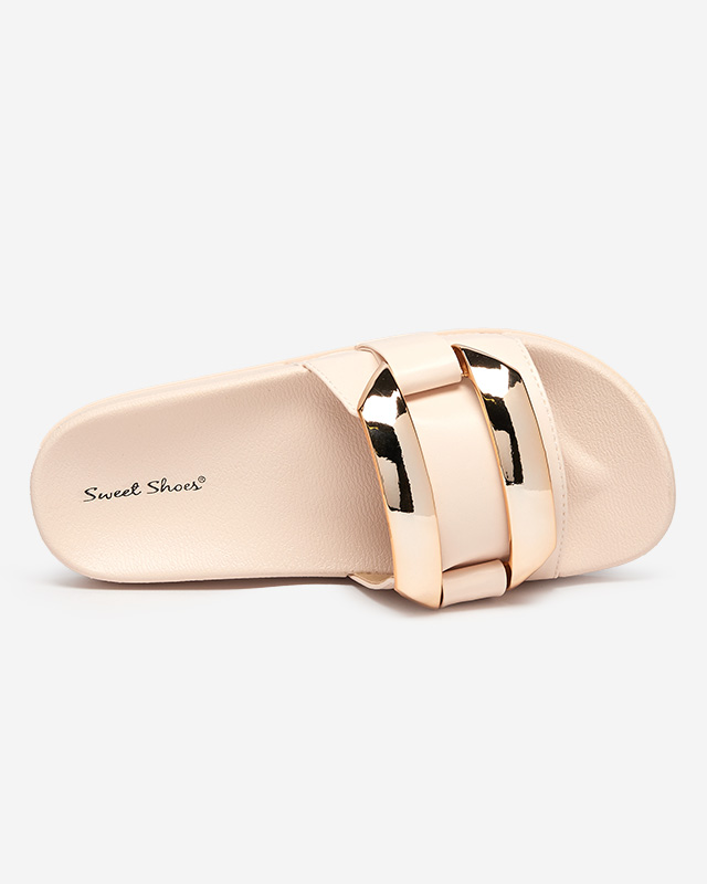 • Pantoufles élégantes pour femmes sur une semelle plate, en cuir écologique. Un modèle avec un grand ornement en plastique de couleur dorée, il a un insert et une semelle en caoutchouc. REMARQUE : le modèle peut présenter de légères rayures sur la tige.