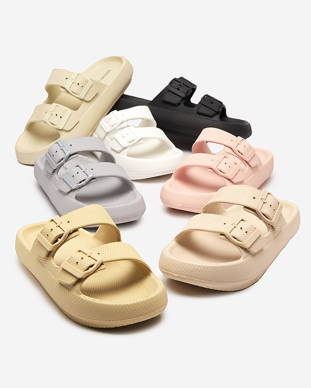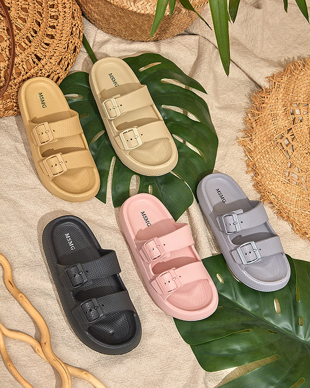 • Chaussons femme classiques sur semelle plate avec 2 boucles. Le modèle est entièrement en caoutchouc. Disponible en plusieurs couleurs - un excellent ajout à vos tenues décontractées ! REMARQUE : le modèle n'a pas de boîte, il est emballé dans du papier d