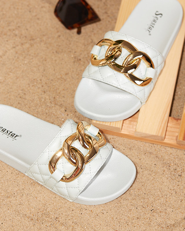 • Les pantoufles pour femmes les plus en vogue de cette saison en cuir écologique matelassé. Le modèle est orné d'une grande chaîne en plastique de couleur dorée. La semelle intérieure et la semelle sont en caoutchouc. Remarque : le produit présente une déc