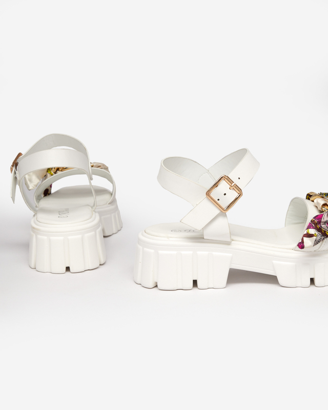 • Magnifiques sandales pour femmes sur une semelle épaisse. Le modèle est en cuir écologique et est décoré d'une chaîne en plastique avec un ruban. La base parfaite pour de nombreux looks de tous les jours ! Remarque : le produit présente une décoloration s