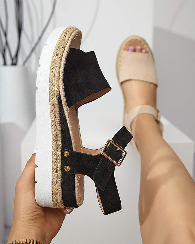- Sandales pour femmes en daim écologique, fermées par une boucle sur le côté et sur un talon compensé moyen. La semelle est en caoutchouc avec un cordon de jute supplémentaire, la semelle intérieure est en éco-cuir. Remarque : le produit a de la saleté sur