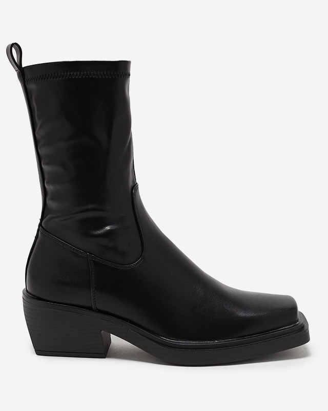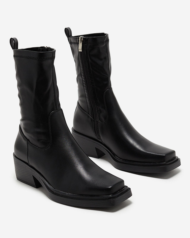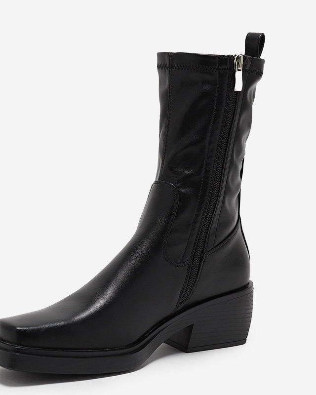 - Bottes hautes pour femmes en cuir écologique. Le modèle a une tige basse, une fermeture zippée sur le côté et un bout carré. Les chaussures sont délicatement isolées. CHAUSSURES HAUTES NOIRES POUR FEMMES BOTTES SAFOG