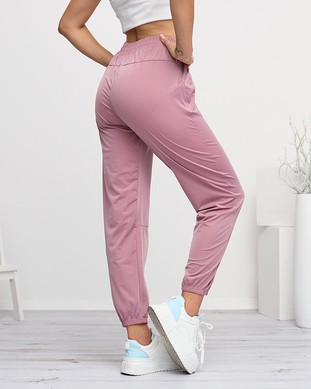 - Jogging femme, en tissu légèrement translucide et glissant. Modèle avec deux poches plaquées, des cordons noués et une large ceinture élastique, les jambes sont finies par une bande élastique. REMARQUE : Précision de mesure (+/-) 1 cm.