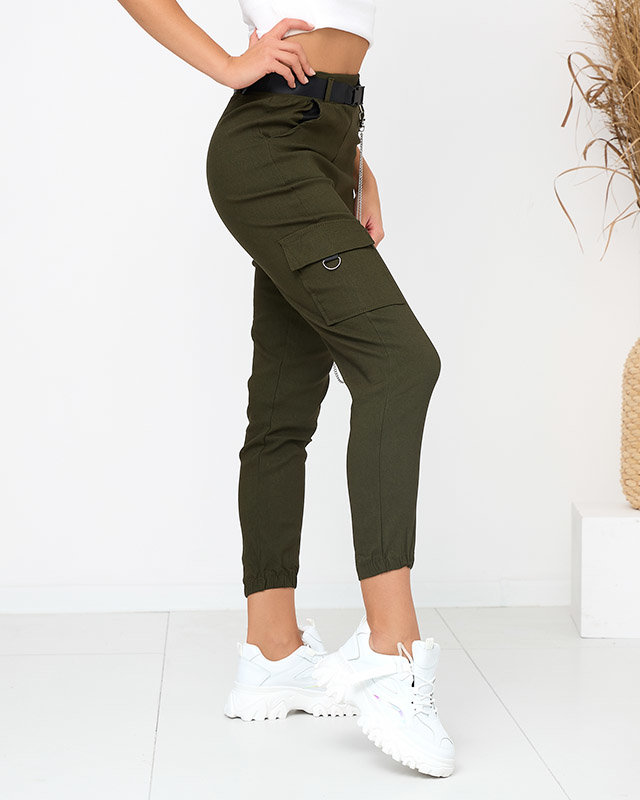 - Pantalon cargo unique en tissu extensible pour femmes. Le modèle a une large ceinture élastique et 4 poches plaquées. Le produit est isolé avec une fine toison. De plus, une ceinture et une chaîne ! REMARQUE : Précision de mesure (+/-) 1 cm.