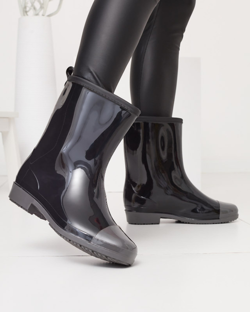 - Bottes classiques pour femmes en caoutchouc avec finition laquée. La semelle intérieure est en tissu. Décorées d'un nez gris. Chaussures idéales pour les jours de pluie d'automne !