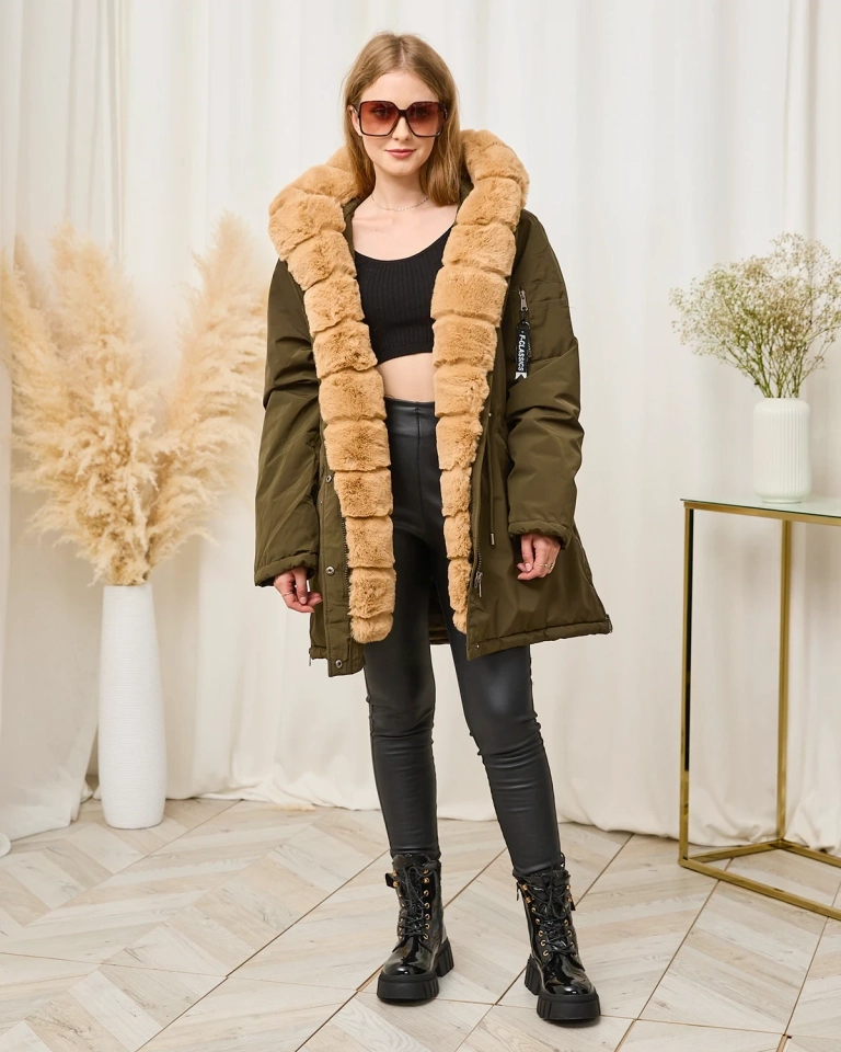 - Veste d'hiver chaude pour femme avec capuche et fourrure amovible et chaude. La veste est fermée par une fermeture éclair et des boutons, possède 2 poches zippées sur les côtés et 2 sur la manche - passepoilées au milieu. Idéal pour l'hiver!