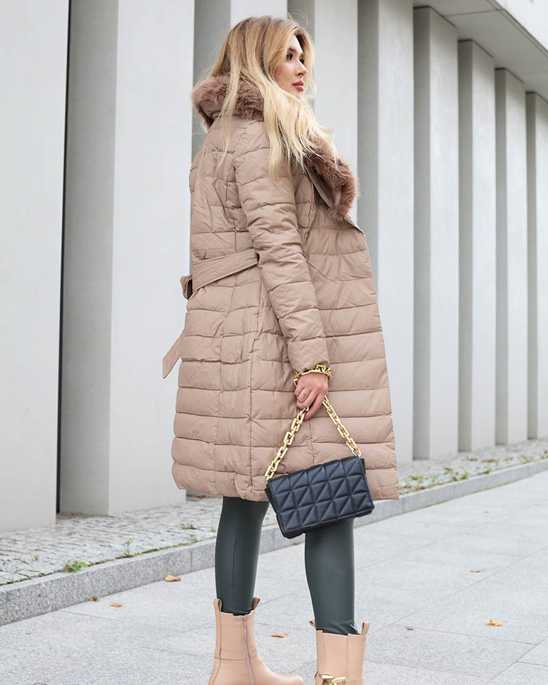 - Veste d'hiver simple pour femme avec fourrure amovible et chaude. La partie supérieure à l'intérieur a également une fourrure douce. La veste est fermée par une fermeture éclair et des boutons, possède 2 poches zippées et une ceinture au dos. Idéal pour l