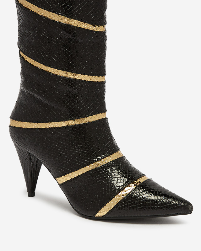 - Bottes à talons aiguilles pour femmes brillantes en cuir écologique décoré de bandes en relief. Elles ont un réchauffement délicat. Modèle à enfiler. Le nez pointu ajoute à leur caractère ! BOTTES ISOLÉES FELIFEA POUR FEMMES, NOIR ET OR