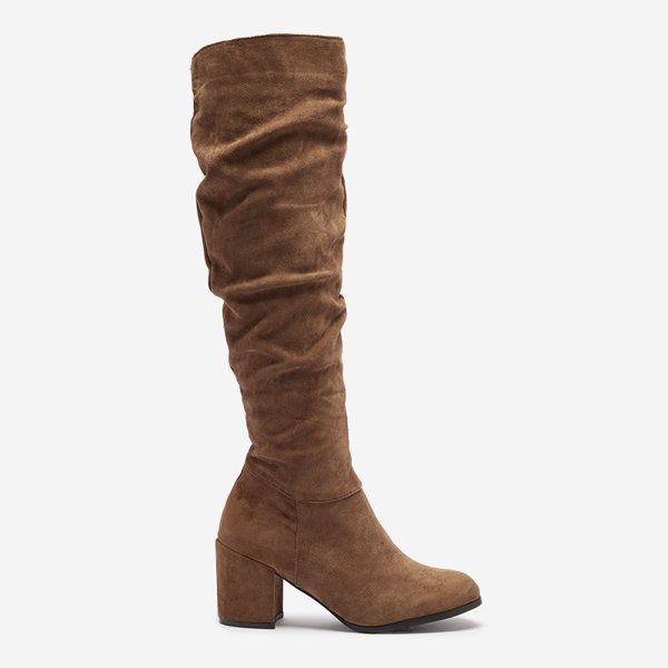 • Belles bottes à hauteur de genou pour femmes sur un poteau stable. En suédine écologique, nez arrondi. Fermeture éclair jusqu'au milieu du mollet. Modèle partiellement isolé avec de la fourrure courte. Remarque : le produit présente des traces de colle su