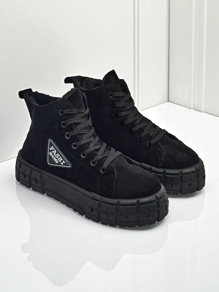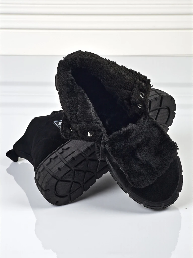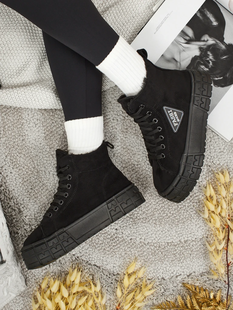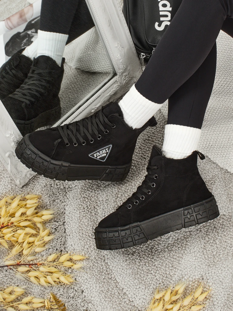 • Bottines pour femmes super stylées sur une plateforme massive, en cuir éco-daim. Le modèle est lacé, l'intérieur est isolé avec de la fourrure. La tige est décorée d'un patch avec une inscription. Une paire parfaite pour tous les jours ! BOTTES ZEFIRA NOI