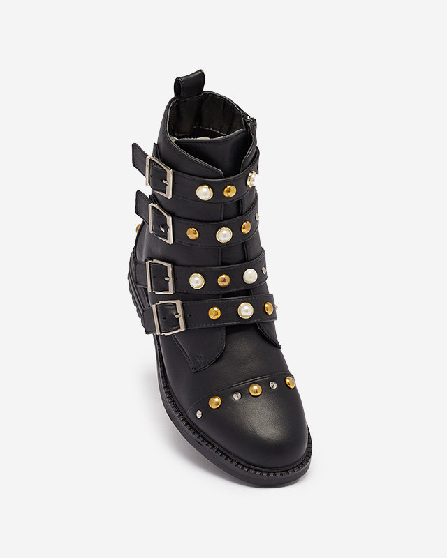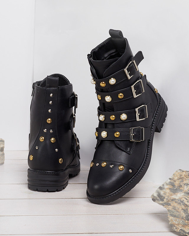- Bottines à talons plats pour femmes en cuir écologique noir. L'intérieur de la chaussure est doublé de mousse souple et la semelle intérieure est en éco-cuir. Le modèle est décoré de fermoirs, clous, jets et perles. Ils seront une excellente décoration po