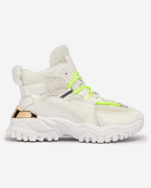 Chaussures de sport blanches pour femmes avec fourrure et lacets vert fluo Sagglo- Footwear