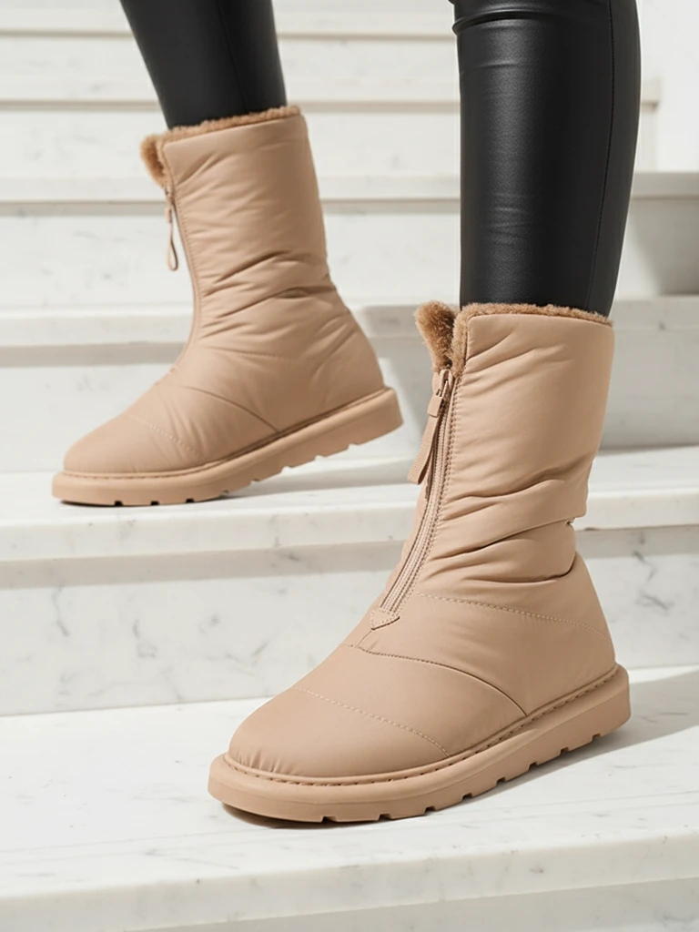 • Chaussures d'hiver élégantes pour femmes, type bottes de neige, la tige est faite d'un matériau synthétique imitation toile cirée. L'intérieur est isolé avec une épaisse fourrure, les chaussures se ferment avec une fermeture éclair à l'avant. BOTTES D'HIV