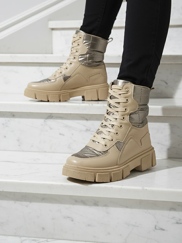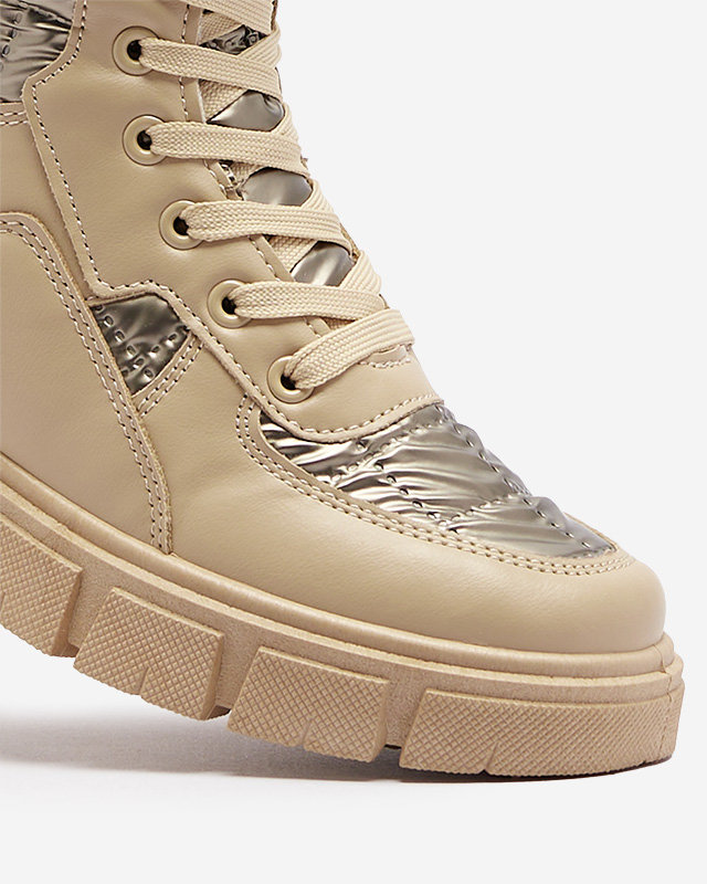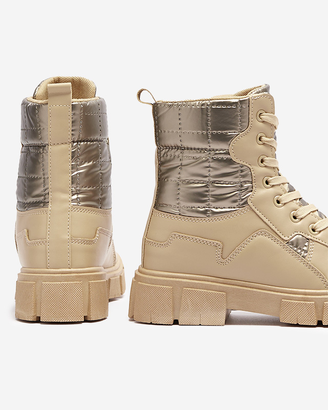 - Superbes bottines lacées pour femmes de style worker, la tige est faite d'une combinaison de cuir écologique et de matière synthétique de type toile cirée avec une finition matelassée. Intérieur doublé de tissu.