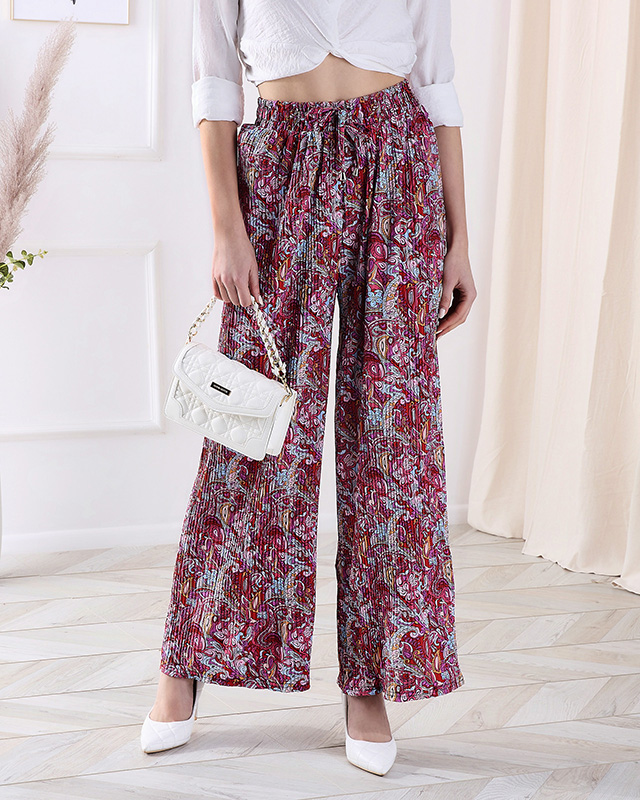 - Pantalon en tissu large à jambes larges. Le modèle est fait de tissu léger et aéré et possède une bande élastique et un pantalon à la taille. Le pantalon est décoré d'un imprimé coloré. Parfait pour l'été ! NOTE : Précision de la mesure (+/-) 1 cm.
