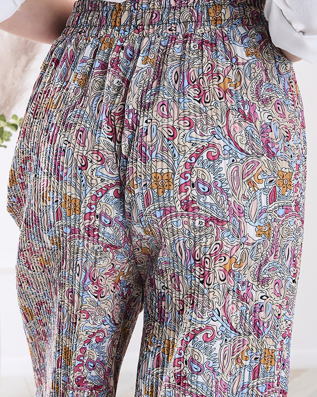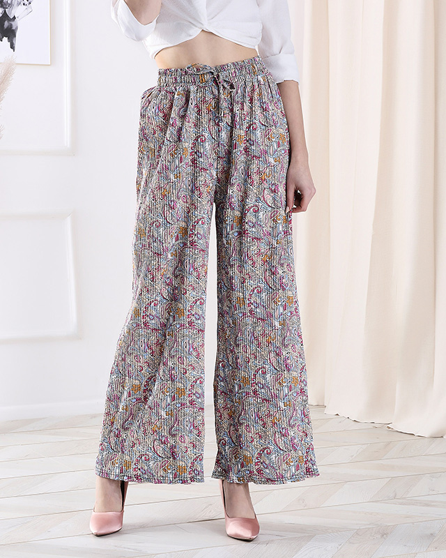 - Pantalon en tissu large à jambes larges. Le modèle est fait de tissu léger et aéré et possède une bande élastique et un pantalon à la taille. Le pantalon est décoré d'un imprimé coloré. Parfait pour l'été ! NOTE : Précision de la mesure (+/-) 1 cm.