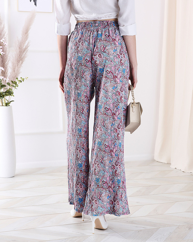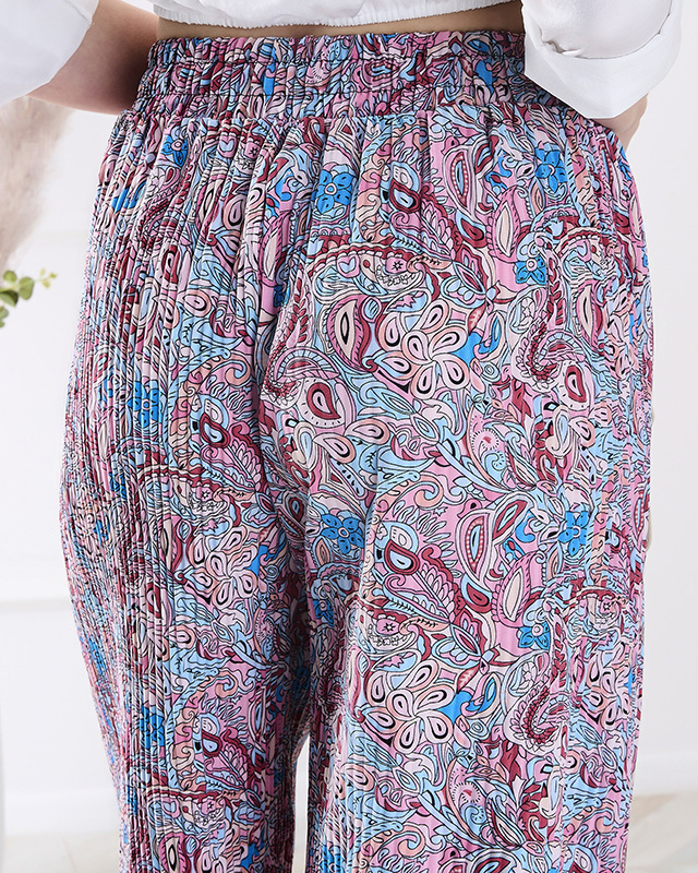 - Pantalon en tissu large à jambes larges. Le modèle est fait de tissu léger et aéré et possède une bande élastique et un pantalon à la taille. Le pantalon est décoré d'un imprimé coloré. Parfait pour l'été ! NOTE : Précision de la mesure (+/-) 1 cm.