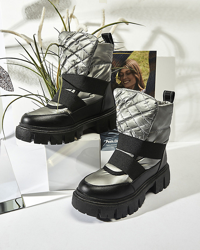 • Sensationnelles bottes de neige pour femmes sur une semelle plus épaisse - la tige est en toile cirée plastique a'la, le milieu est isolé avec de la fourrure. Le modèle est à enfiler et possède des bandes élastiques sur la tige. Remarque : le produit prés