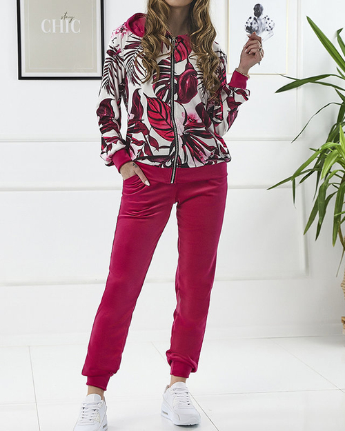 Ensemble sweat-shirt en velours fuchsia pour femme avec motif floral- Vêtements