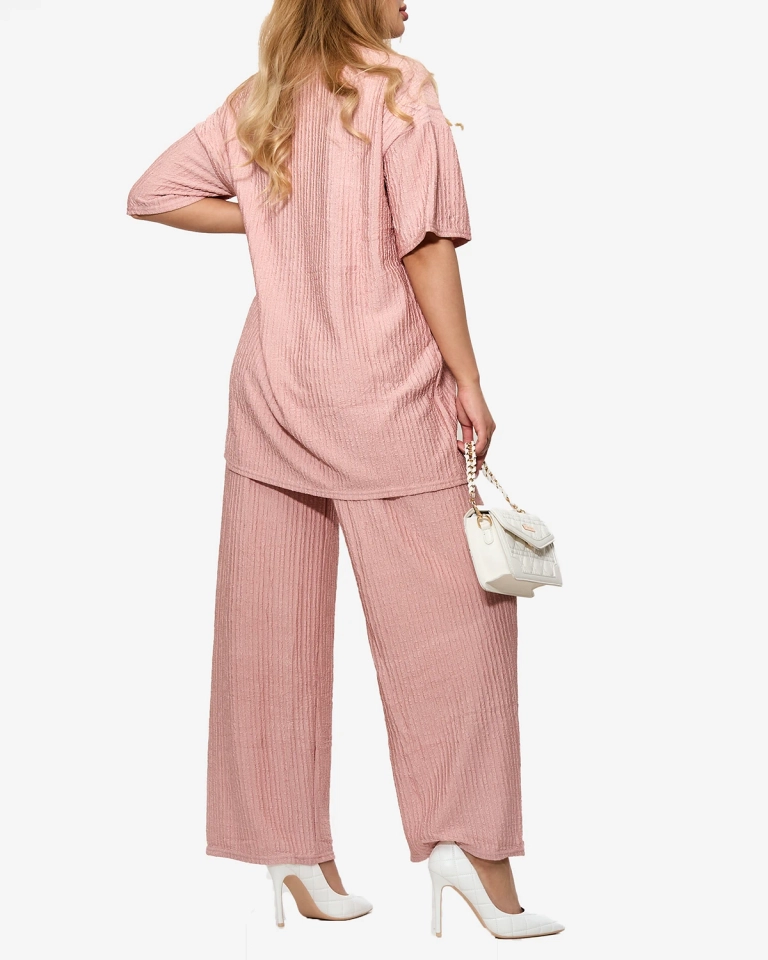 - Ensemble pour femme en tissu côtelé extensible. Chemisier à manches courtes et encolure ronde. Pantalon long palazzo avec taille haute, élastique et liens à la taille. Une combinaison élégante et confortable ! NOTE : Précision des mesures (+/-) 1 cm.