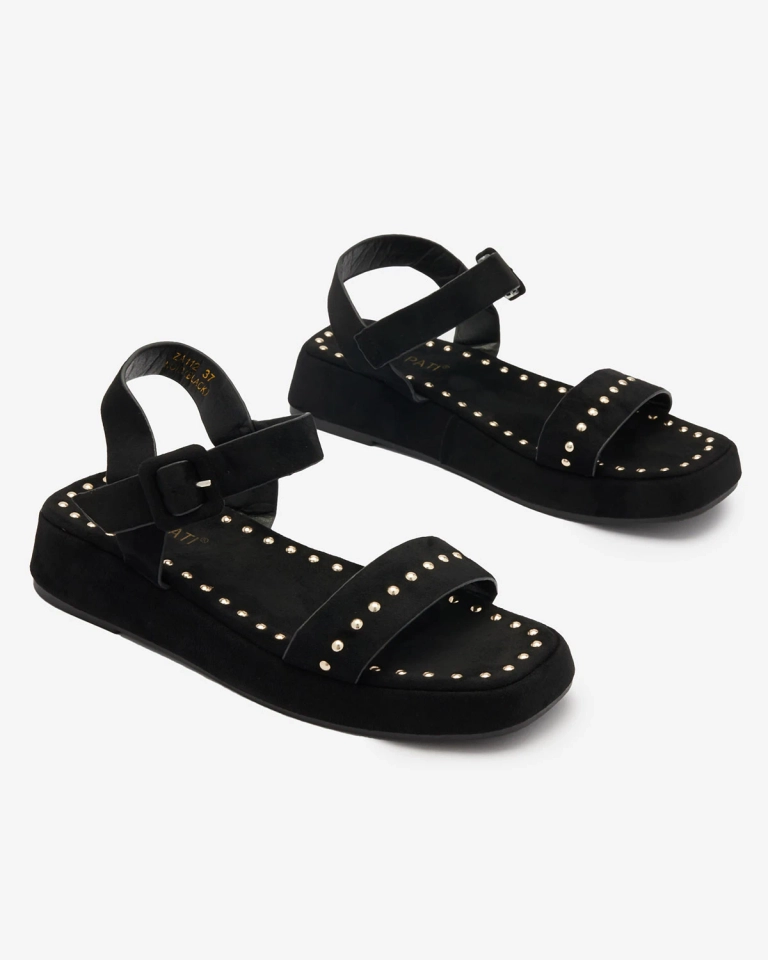 - Sandales pour femme à semelle épaisse, en cuir suédé biologique. Modèle décoré de strass, fermé par une boucle. Chaussures confortables pour l'été !