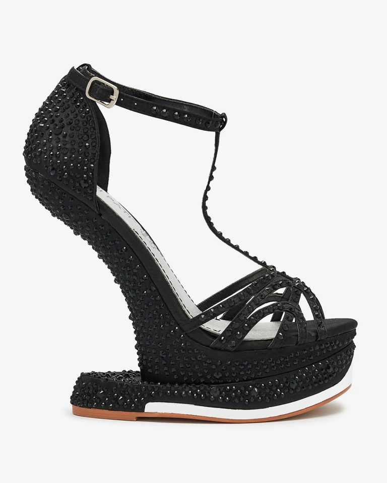 • Escarpins pour femme en tissu et semelle intérieure en cuir naturel. La tige ajourée est décorée de zircons. Le modèle est doté d'une plateforme et d'un talon haut invisible. Les chaussures se ferment à l'aide d'une boucle autour de la cheville.