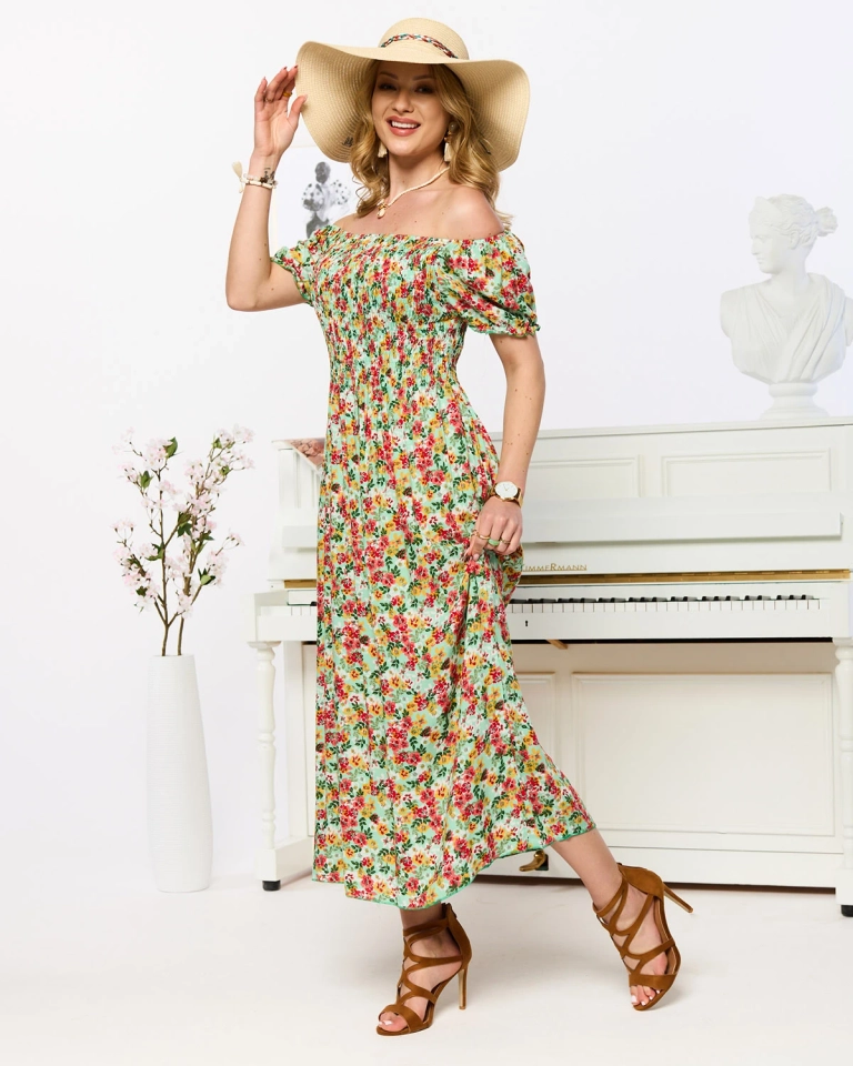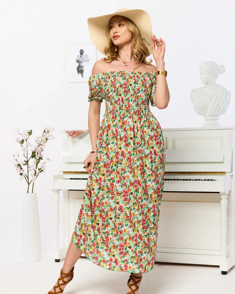 - Robe midi d'été pour femme, en tissu de coton à motif floral. Modèle avec encolure ronde à la hiszpanka et élastique au niveau du buste et de la taille. Modèle à manches courtes. Portez-la avec des sandales ! NOTE : Précision des mesures (+/-) 1 cm.