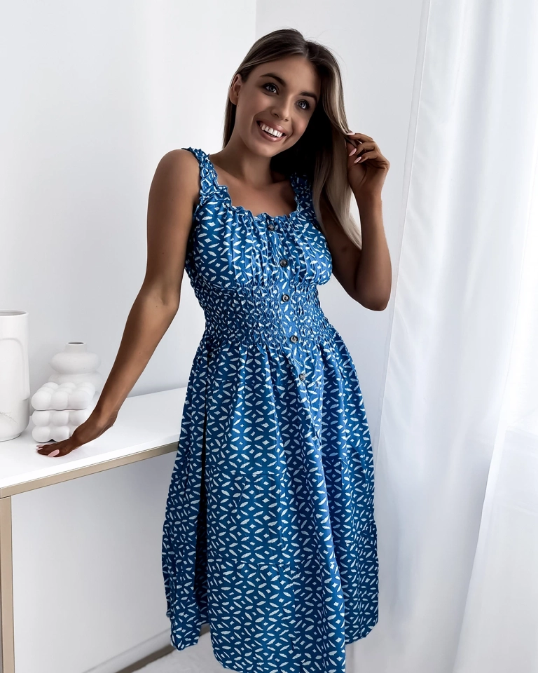 Robe femme au genou avec imprimé en bleu- Vêtements