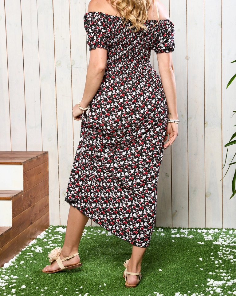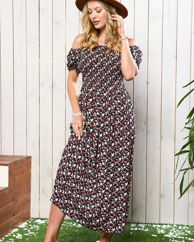 - Robe fantaisie pour femme avec épaules ouvertes à la hiszpana. Le modèle est en tissu floral léger et aéré. Au niveau du buste, une large bande élastique extensible. Le produit de longueur midi a des manches courtes. NOTE : Précision des mesures (+/-) 1 c