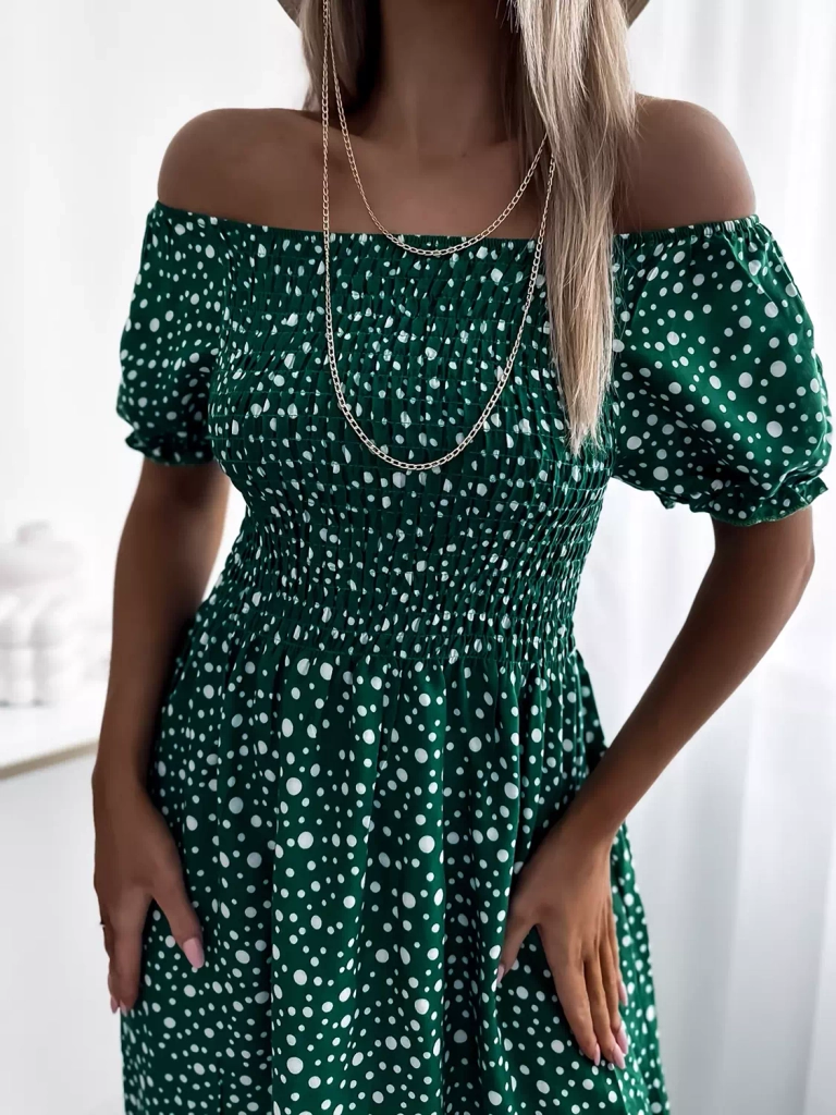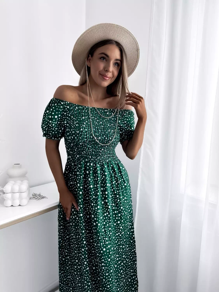 • Robe longue à pois pour femme printemps, en tissu de coton. Modèle avec encolure ronde à la hiszpanka et élastique au niveau du buste et de la taille. Modèle à manches courtes. Portez-la pour une promenade ! NOTE : Précision des mesures (+/-) 1 cm.