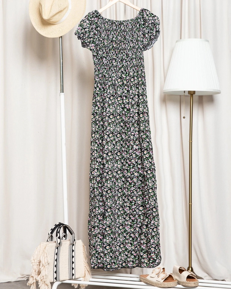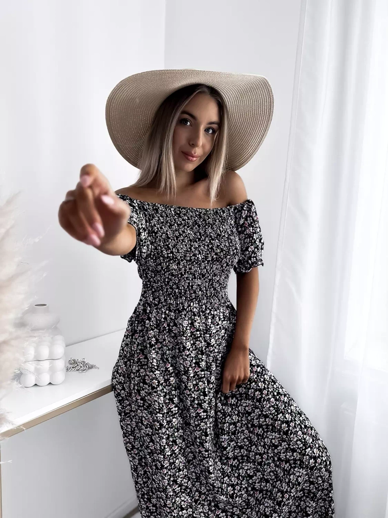 - Magnifique robe midi à fleurs pour femme. Le modèle à manches courtes est doté d'une large bande élastique au niveau du buste. Le produit est fabriqué en tissu léger coton-polyester. Indispensable pour l'été ! NOTE : Précision des mesures (+/-) 1 cm
