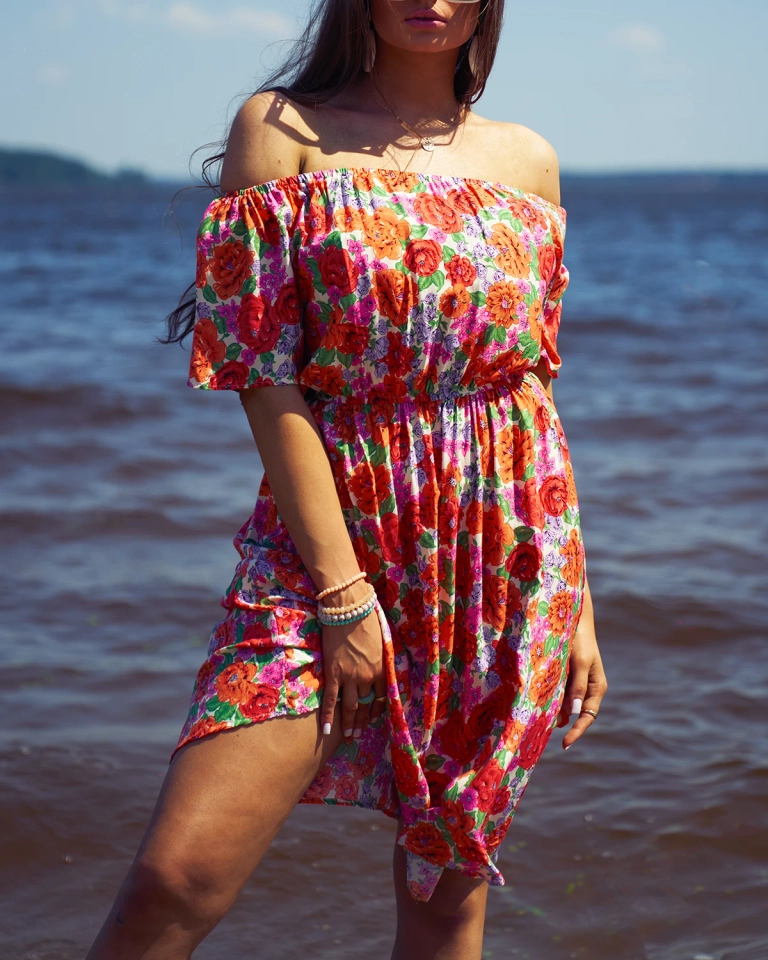 - Mini robe délicate pour femme décorée d'un imprimé floral. Modèle à encolure hiszpana avec élastique aux épaules et à la taille. La robe a des manches courtes. Idéale pour les vacances ! NOTE : Précision des mesures (+/-) 1 cm.