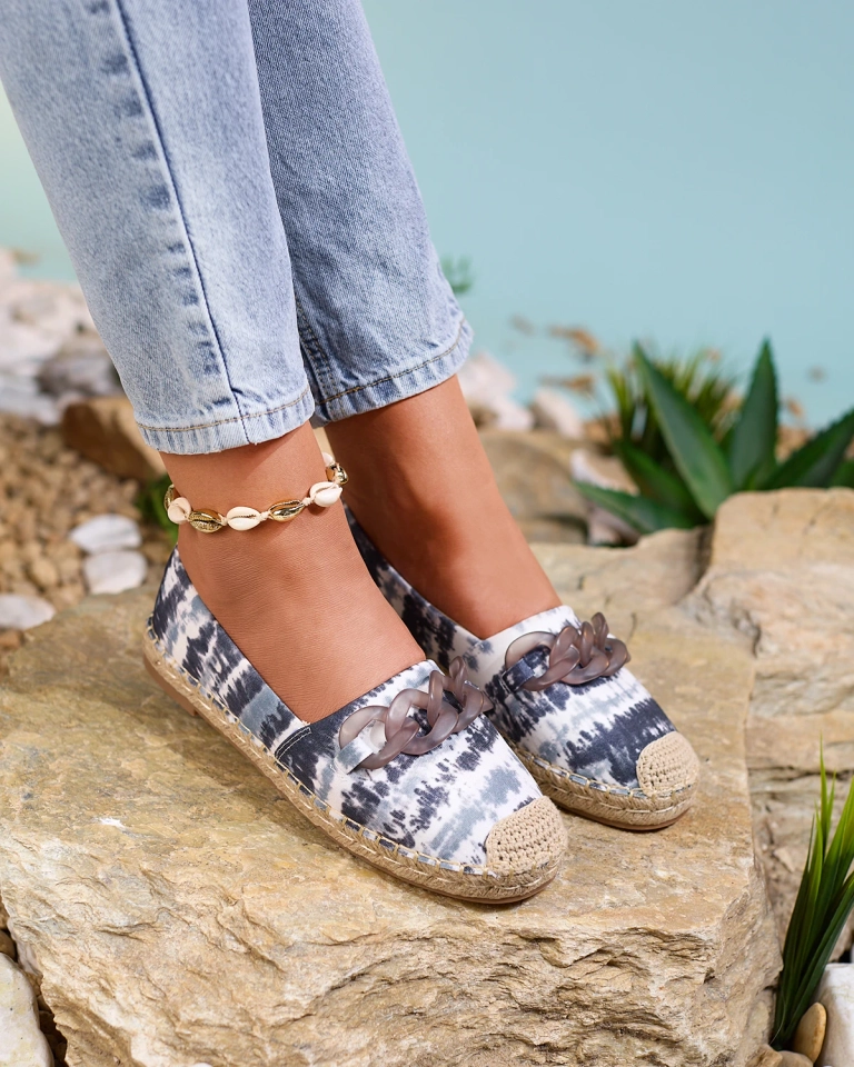 - Espadrilles légères pour femme entièrement en tissu. La semelle est terminée par un cordon de jute. Le nez rond est orné d'une décoration en plastique. Modèle décoré d'un imprimé intéressant. Parfaites pour l'été !