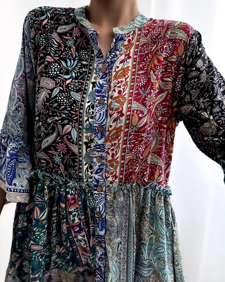 - Robe courte pour femme à motifs multicolores, confectionnée dans une matière glissante à la manière de la soie. La robe est boutonnée, a des manches 3/4 et le bas de la robe est fini avec des volants. Parfaite pour l'été ! REMARQUE : précision des mesures