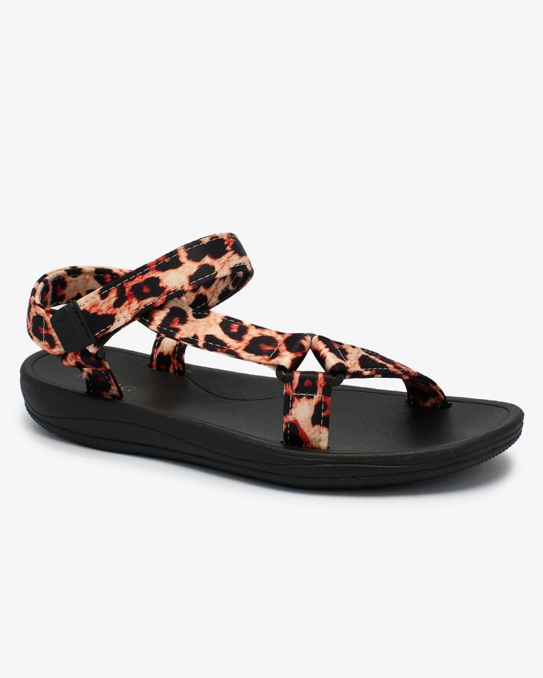 - Sandales pour femme en tissu décoré d'un motif léopard. Confortable semelle plate en caoutchouc. Fermeture de la chaussure par bandes velcro. Parfaites pour tous les jours !