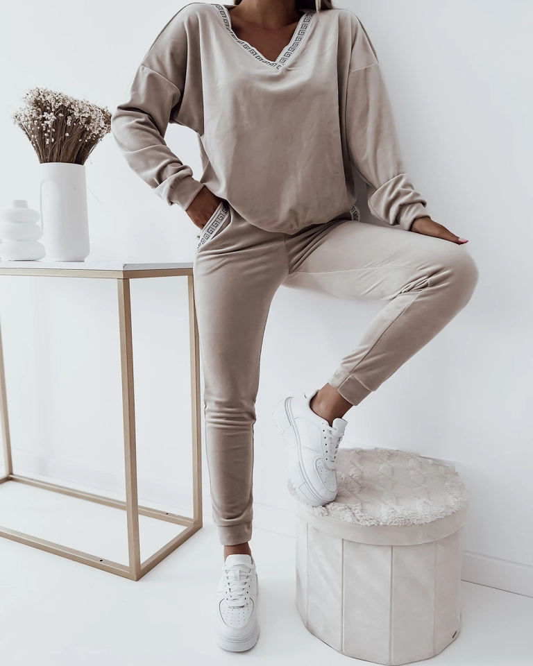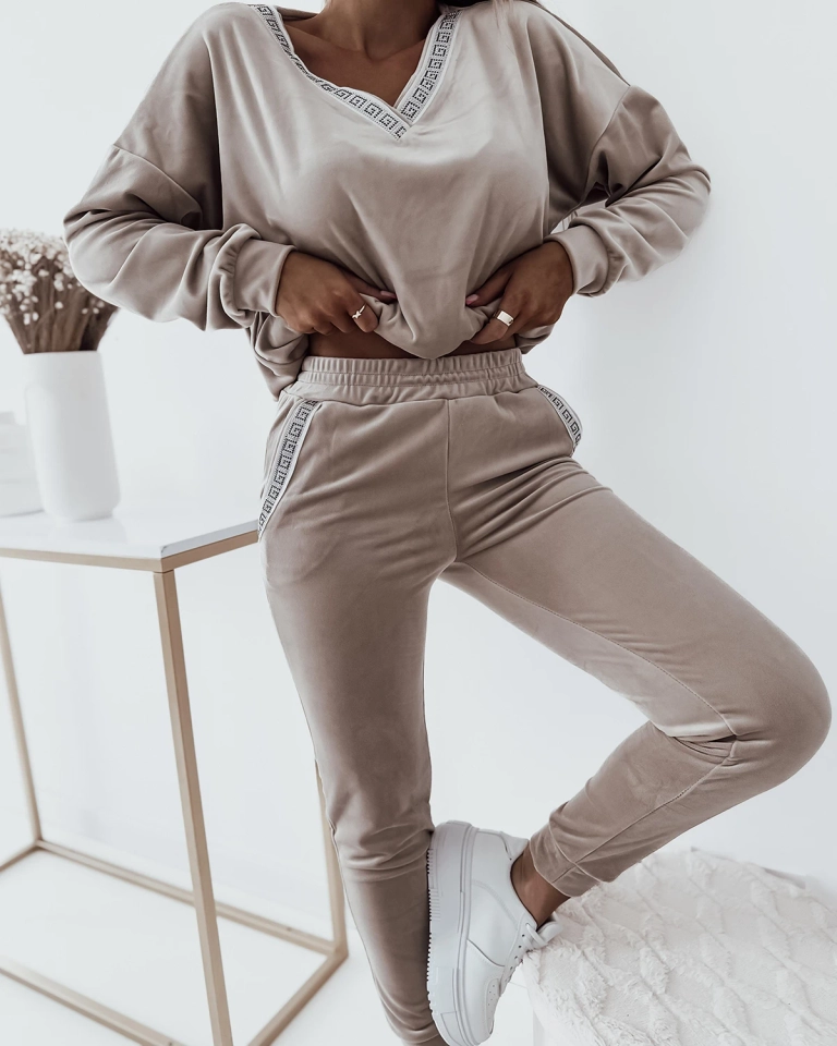 - Préparez-vous à un style exceptionnel et à un confort luxueux avec cet ensemble 2 pièces. Il se compose d'une blouse à manches longues avec une encolure en cœur et d'un pantalon avec des poches à glissière. L'ensemble est réalisé en velours a'la et décoré