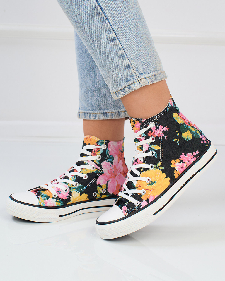 • Baskets hautes pour femme en tissu sur une semelle en caoutchouc. À lacets, elles offrent un ajustement parfait. Décorées d'un imprimé floral, elles apportent charme et caractère estival. Parfaites pour le style de tous les jours !
