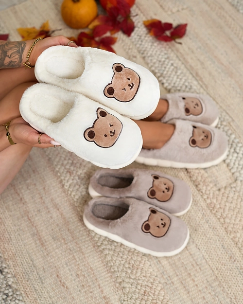 - Pantoufles uniques pour femme sur une semelle plate, décorées d'un écusson en forme d'ours en peluche. Le modèle est fabriqué dans une matière imitant la fourrure. Une excellente option pour les tenues d'intérieur !