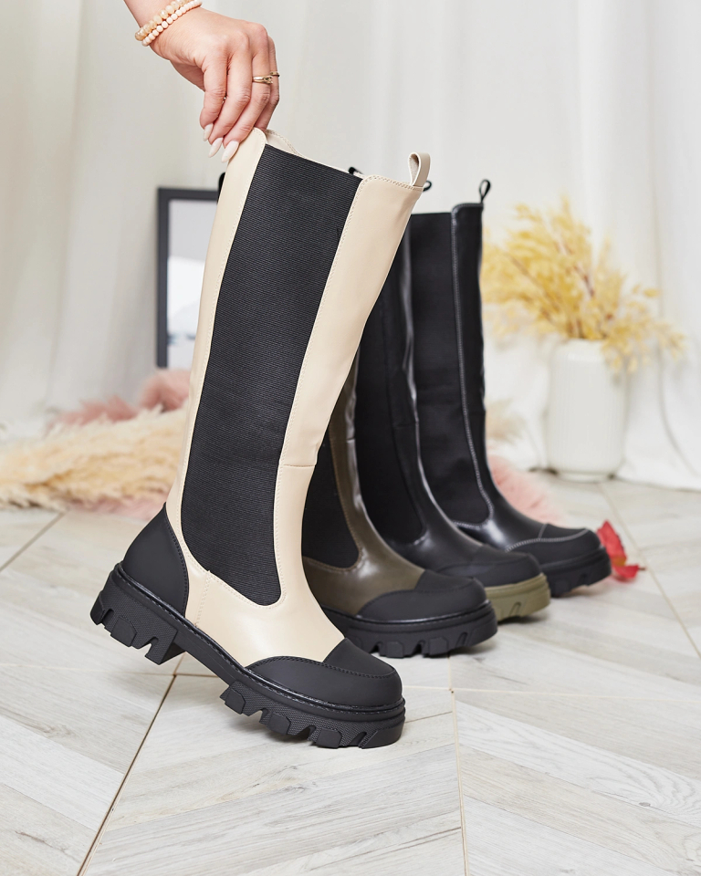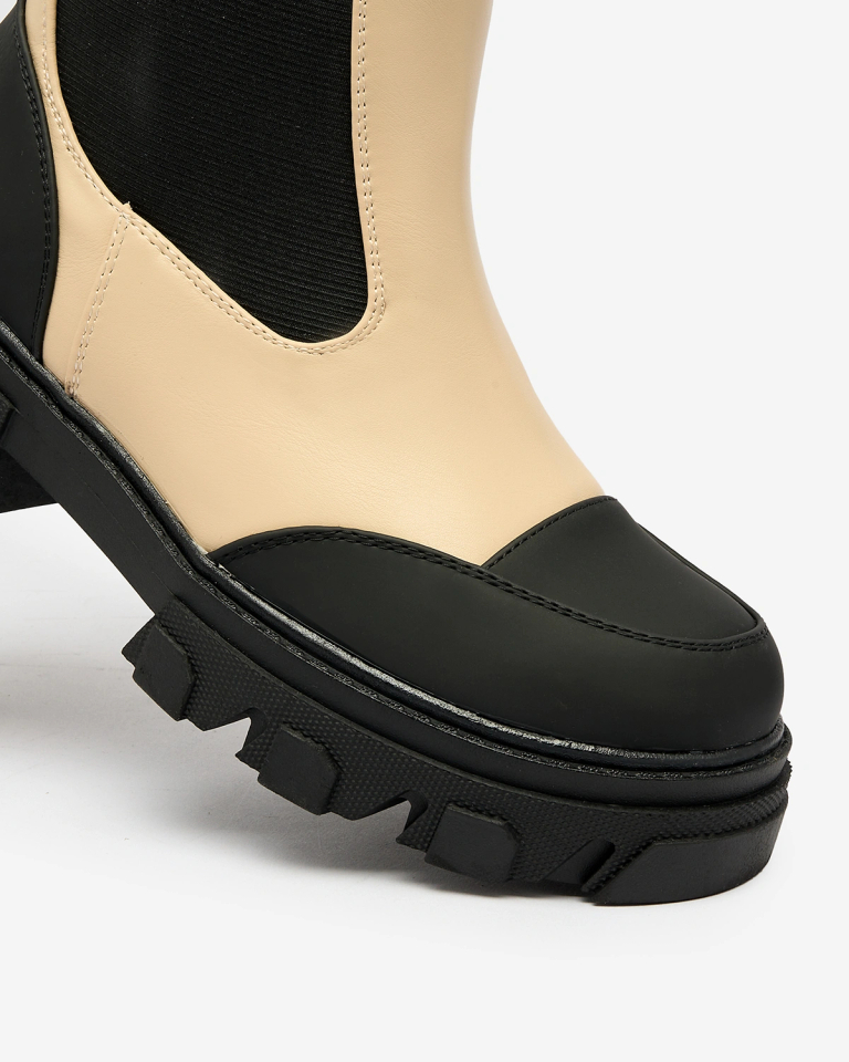 • Bottes mi-mollet pour femme, en cuir écologique avec semelle intérieure en tissu. Modèle à talon plat. Inserts décoratifs en cuir écologique mat sur le nez et le talon. Chaussures à fermeture éclair avec insert élastique sur le côté.
