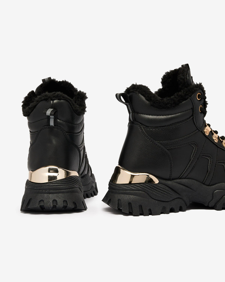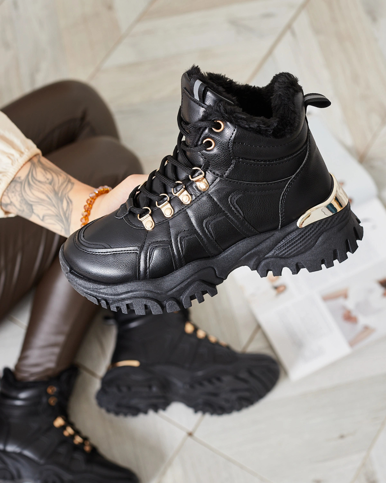 - Baskets de sport pour femme à semelle épaisse. Dessus lacé, en cuir écologique. Intérieur entièrement isolé avec de la fourrure. Parfaites pour les tenues sportives !