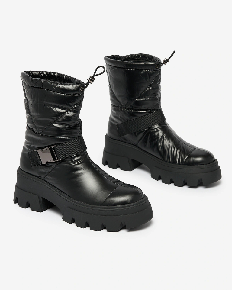 - Bottes de neige pour femme avec tige en toile cirée a'la. Semelle intérieure en tissu, chaussures à enfiler. Le modèle est doté d'une trépointe à l'extrémité de la tige et d'une boucle décorative. Élégant et confortable !