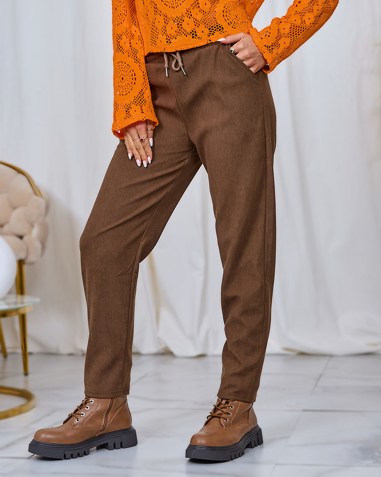 - Pantalon droit sensationnel pour femme en velours côtelé. Le modèle a une ceinture élastique avec des liens réglables. En outre, deux poches à glissière sur le devant. Parfait pour créer des tenues élégantes !